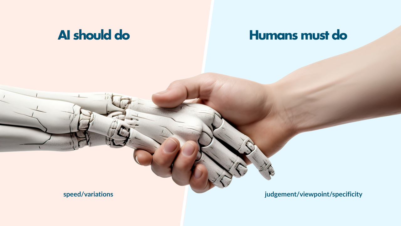 Then humans do the part that creates separation: the viewpoint, the examples, the specificity, the proof, and the edits that carry real authority.
